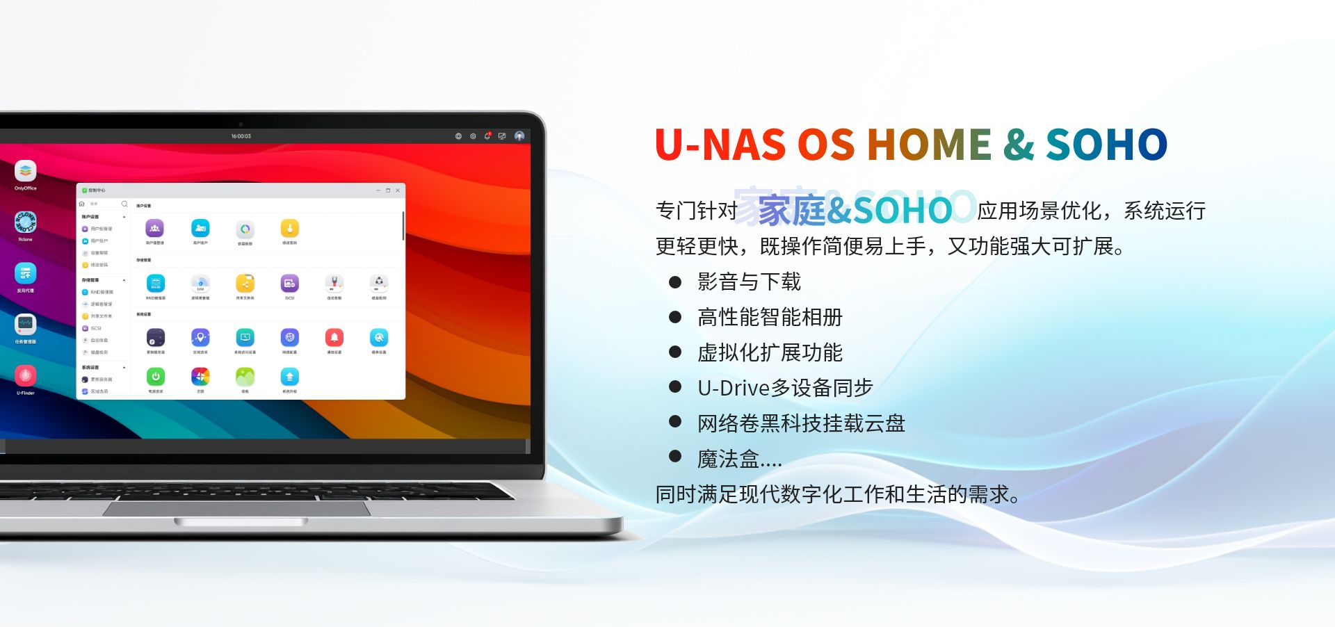 基于萬由U-NAS OS 體系的存儲、備份、私有云服務的一體化平臺,為企業提供一套安全、高性能、彈性可擴展的一體化數據統一管理、主動備份和數據在不同地區、不同設備同步的解決方案。并提供個性化的定制服務,使企業的TOC(總體擁有成本)最低